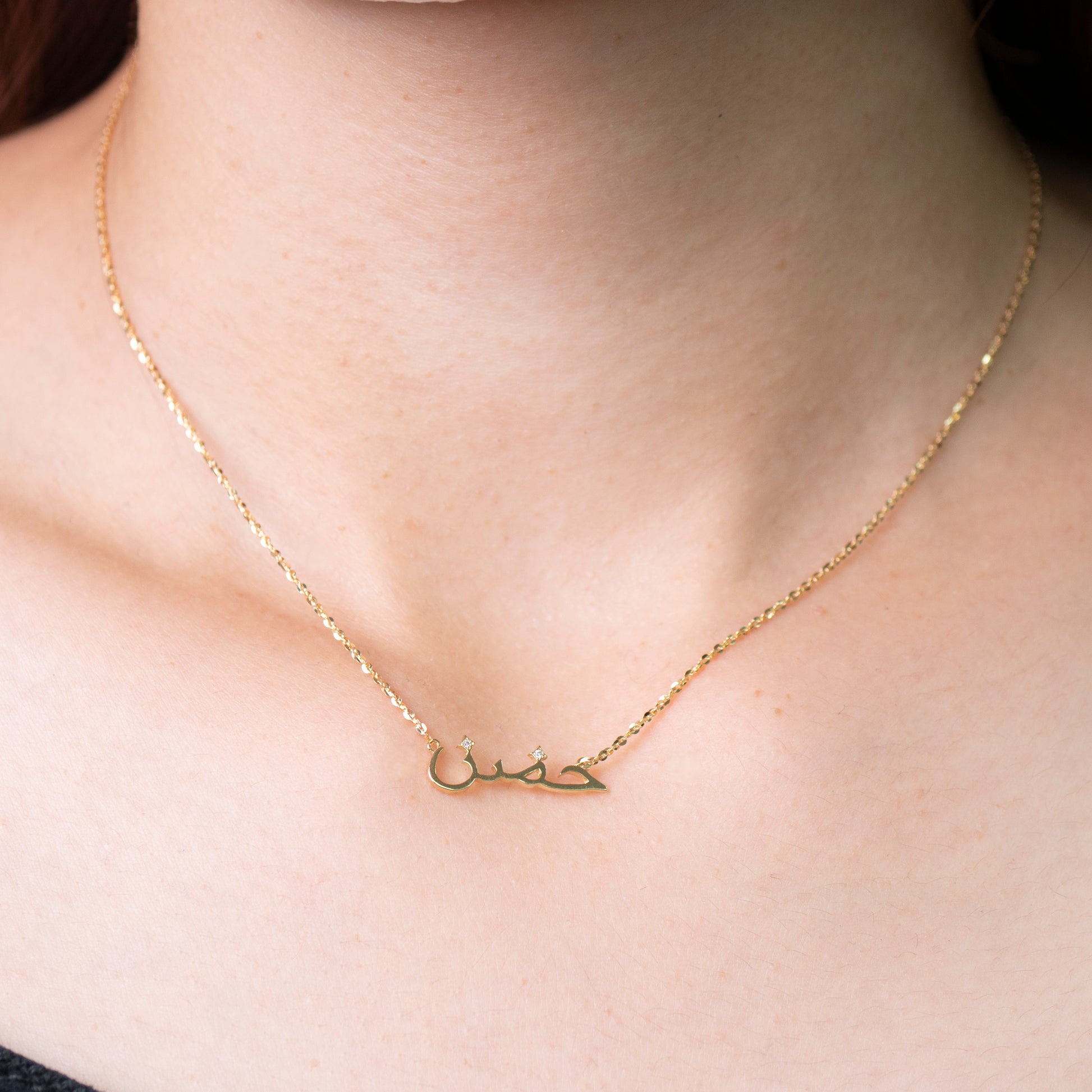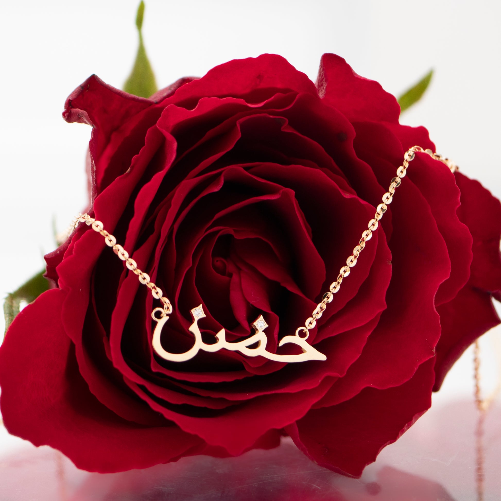 地金の洗練された質感と、アラビア文字特有の芸術的なフォルムが融合し、日常の装いにエキゾチックで知的な品格を添える。