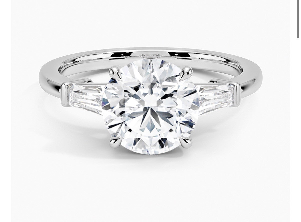 センターで輝きに包まれるラウンドカットのダイヤモンドと、モダンなサイド テーパード バゲットカット ダイヤモンドとの美しいコントラスト。JEWELILYTOKYOのダイヤモンドへの情熱を感じさせる王道の輝きがここに。
