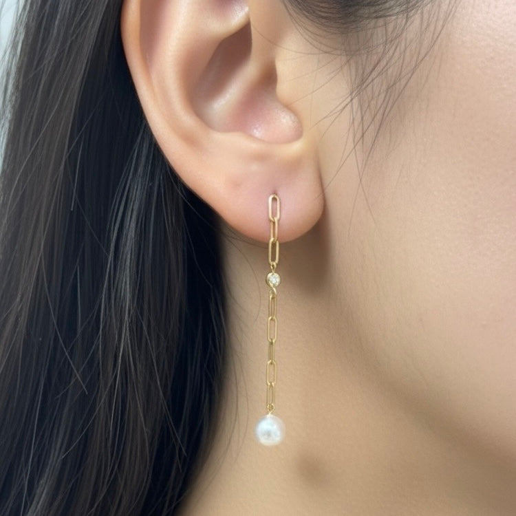気品ある佇まい、揺れるたびに凛とした美しさを。 繊細なラインに、一粒のダイヤモンドと日本の豊かな自然が生んだアコパールを添えたロングピアス。 そのシルエットは、内なる強さと優雅さを兼ね備えた「凛」とした女性の美意識を象徴しています。 ダイヤモンドの煌めきと、パールの柔らかな光が耳元でかすかに揺れるたび、日常の装いにモードな品格を授ける。 |