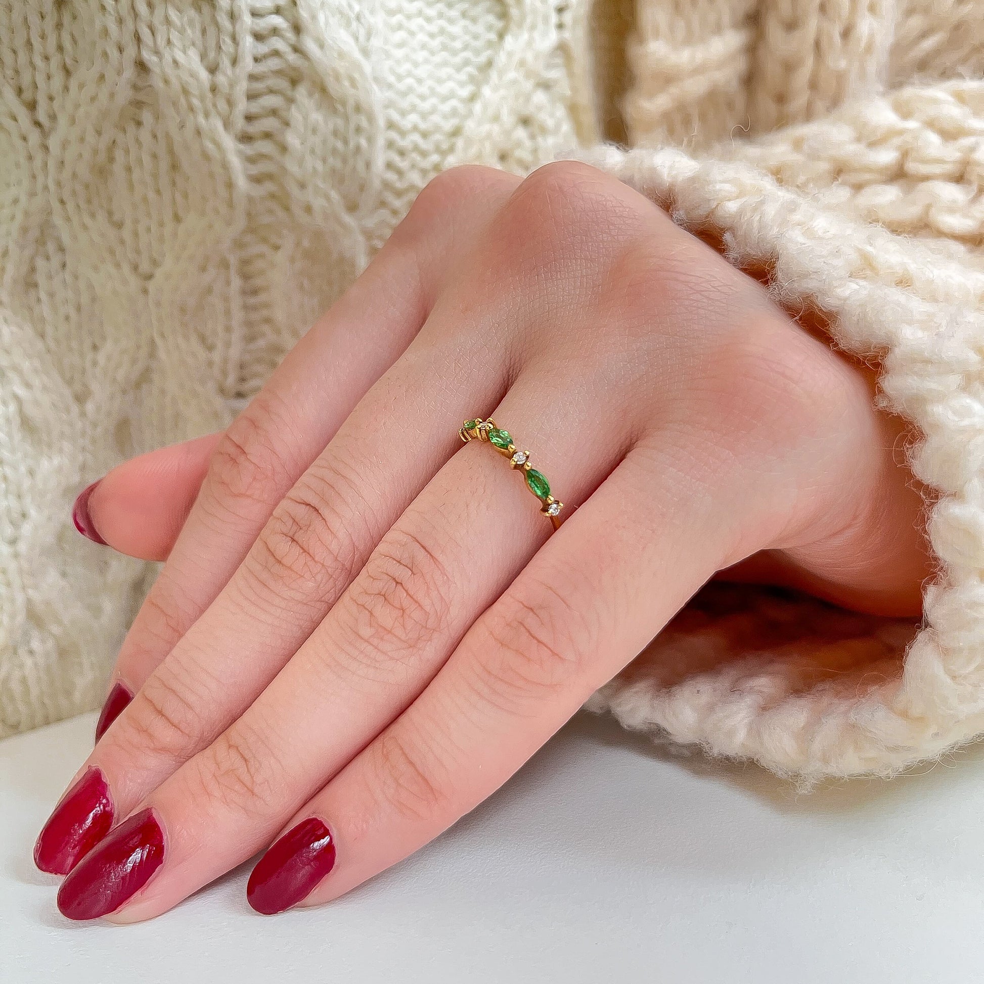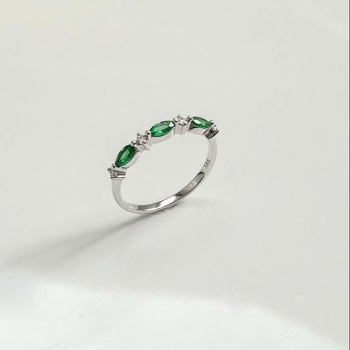 上品で洗練された輝き「Marquise Leaf」 自然の美しさを指元に。繊細なデザインが魅力の「Marquise Leaf」リングをご紹介します。 このリングは、高品質な18Kイエローゴールドを贅沢に使用し、熟練の職人が一つひとつ丁寧に作り上げました。 最大の特徴は、葉っぱ(リーフ)をモチーフにしたデザインです。美しく輝く天然ダイヤモンドを上品に配置し、その間に鮮やかなグリーンのマーキスカット・エメラルドをあしらいました。 マーキスカット独特のシャープな輝きと、リーフデザインの曲線美が絶妙に調和し、指元に洗練された印象を与えます。 「Marquise Leaf」は、単体で着用しても存在感がありますが、他のリングとの重ね付けもおすすめです。日常使いからフォーマルなシーンまで、幅広く活躍します。18Kゴールドと天然石が織りなす極上の輝きを、ぜひお手元でご実感ください。 |